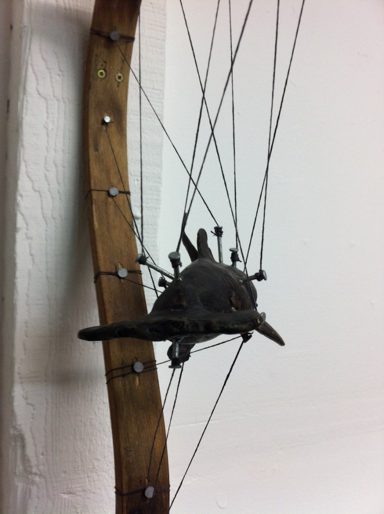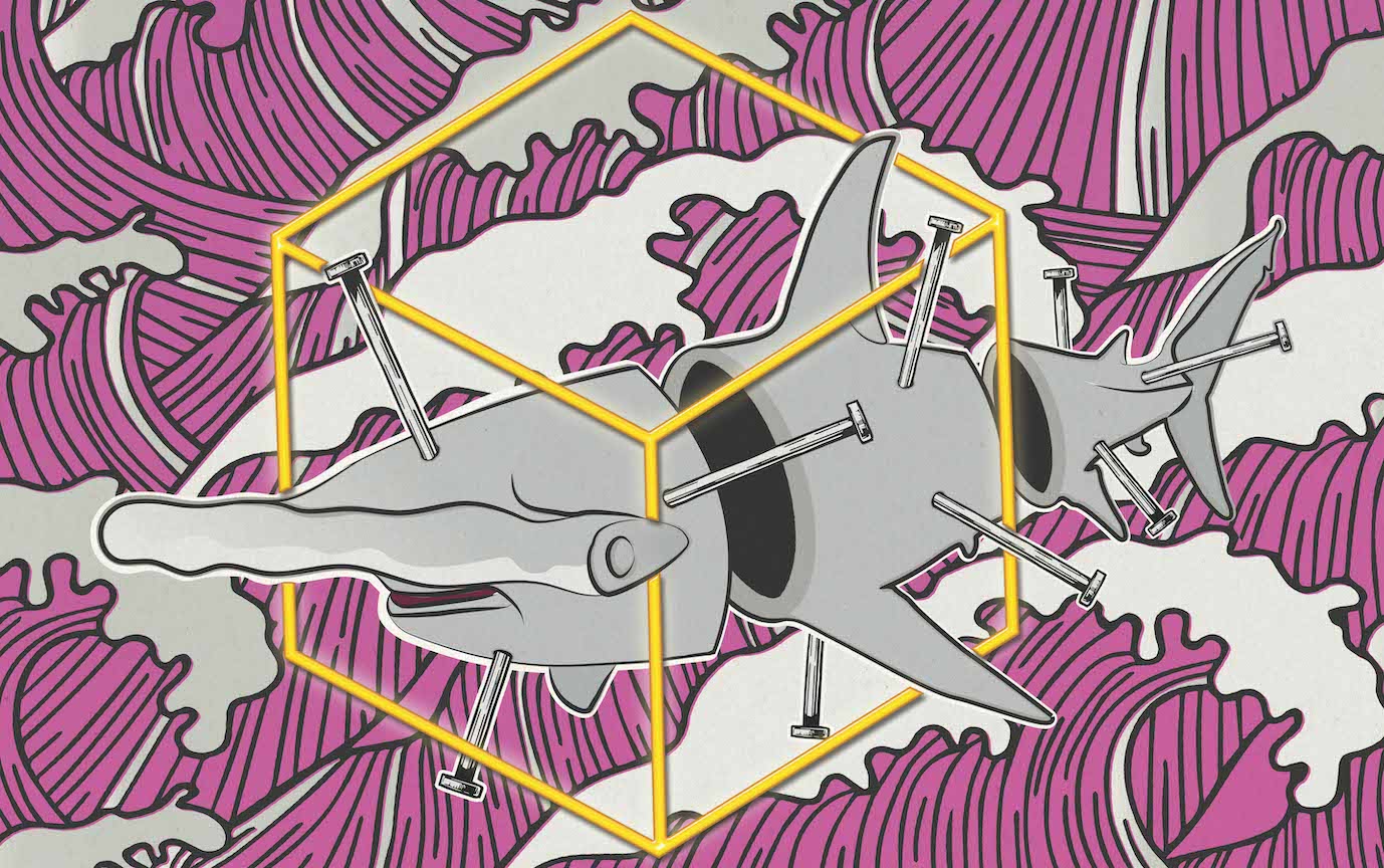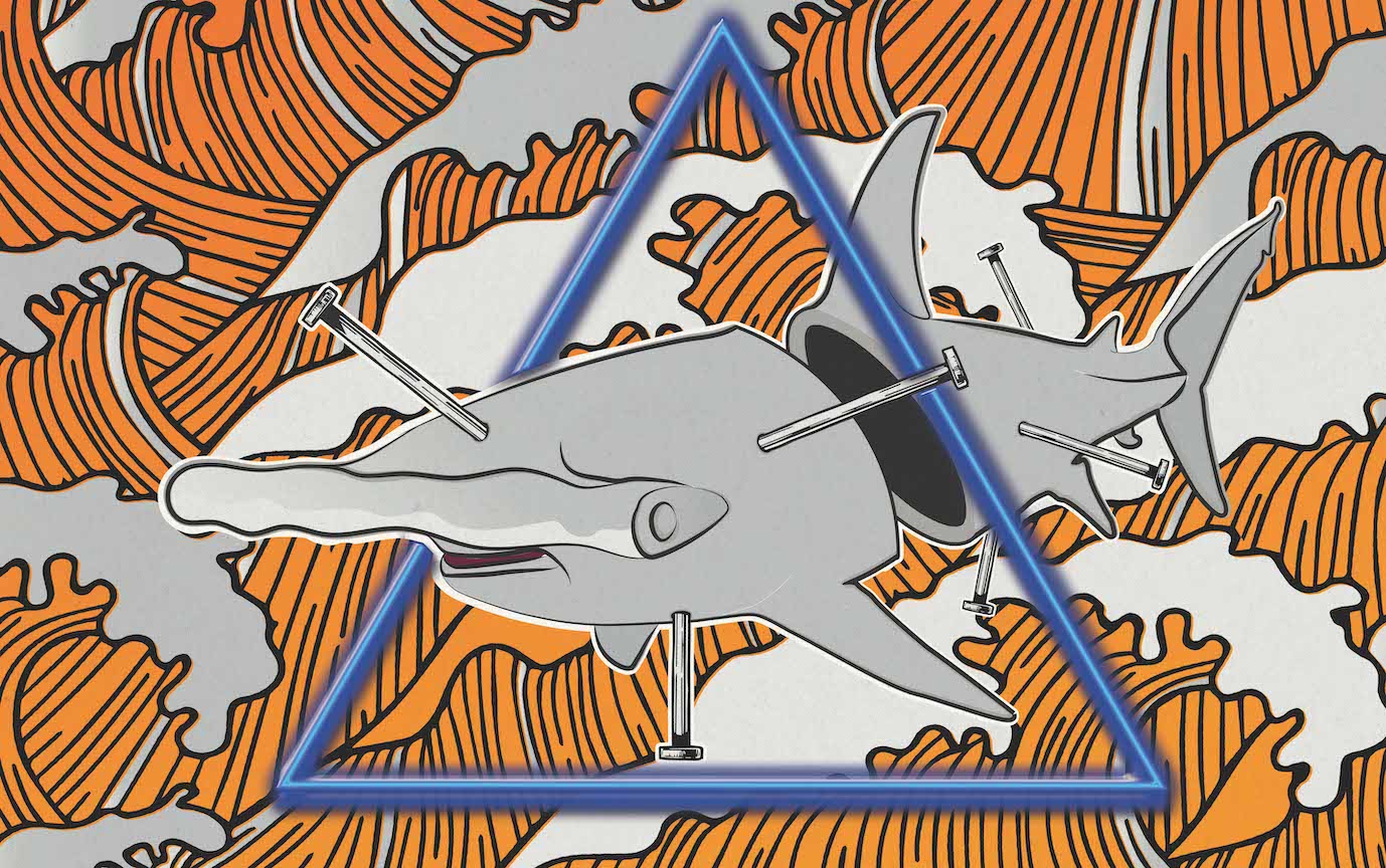 The Hammerhead Shark has come to represent the natural order o’ things; evolution and mutation that can create such a creature. The Nails represent man’s attempt to control nature with systems such as language, logic, money and politics.