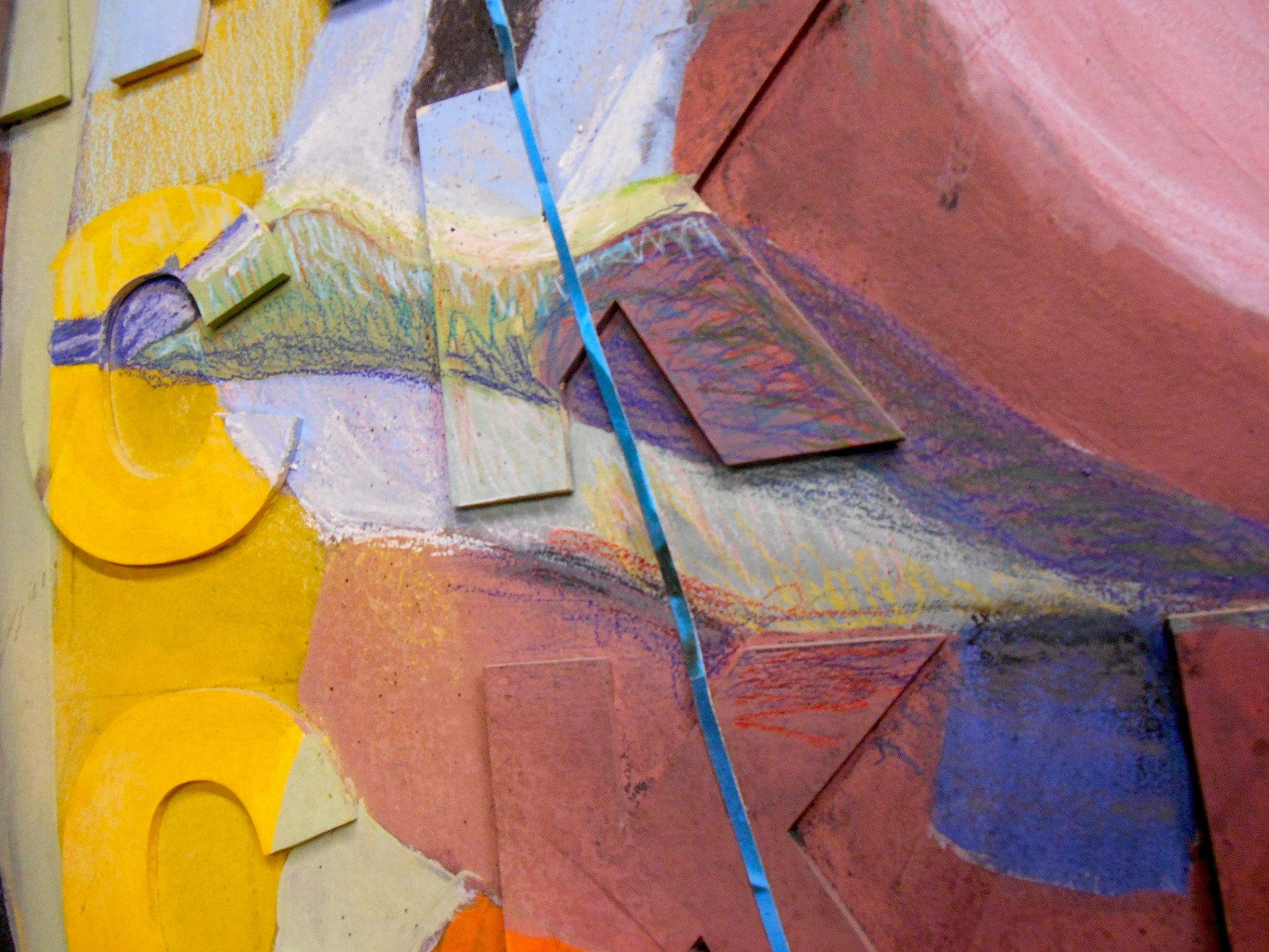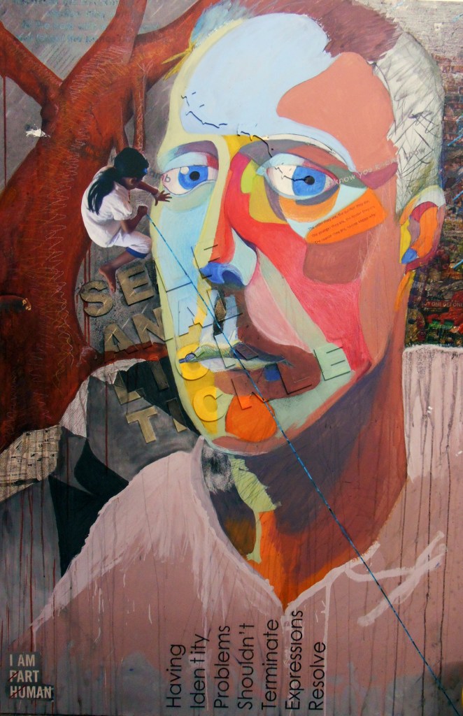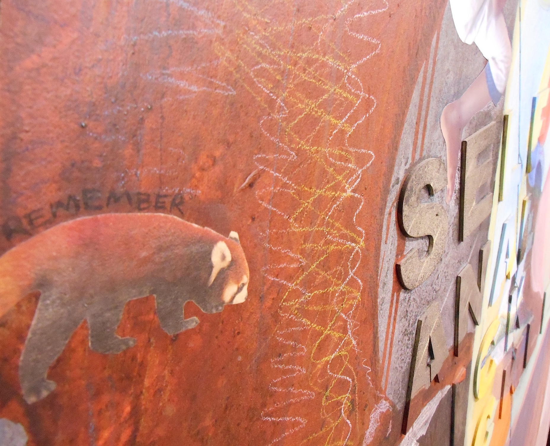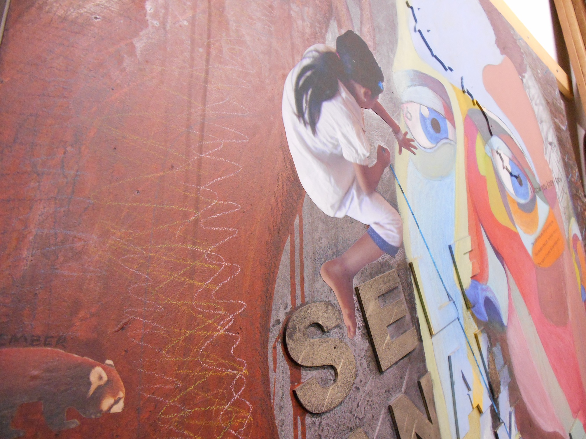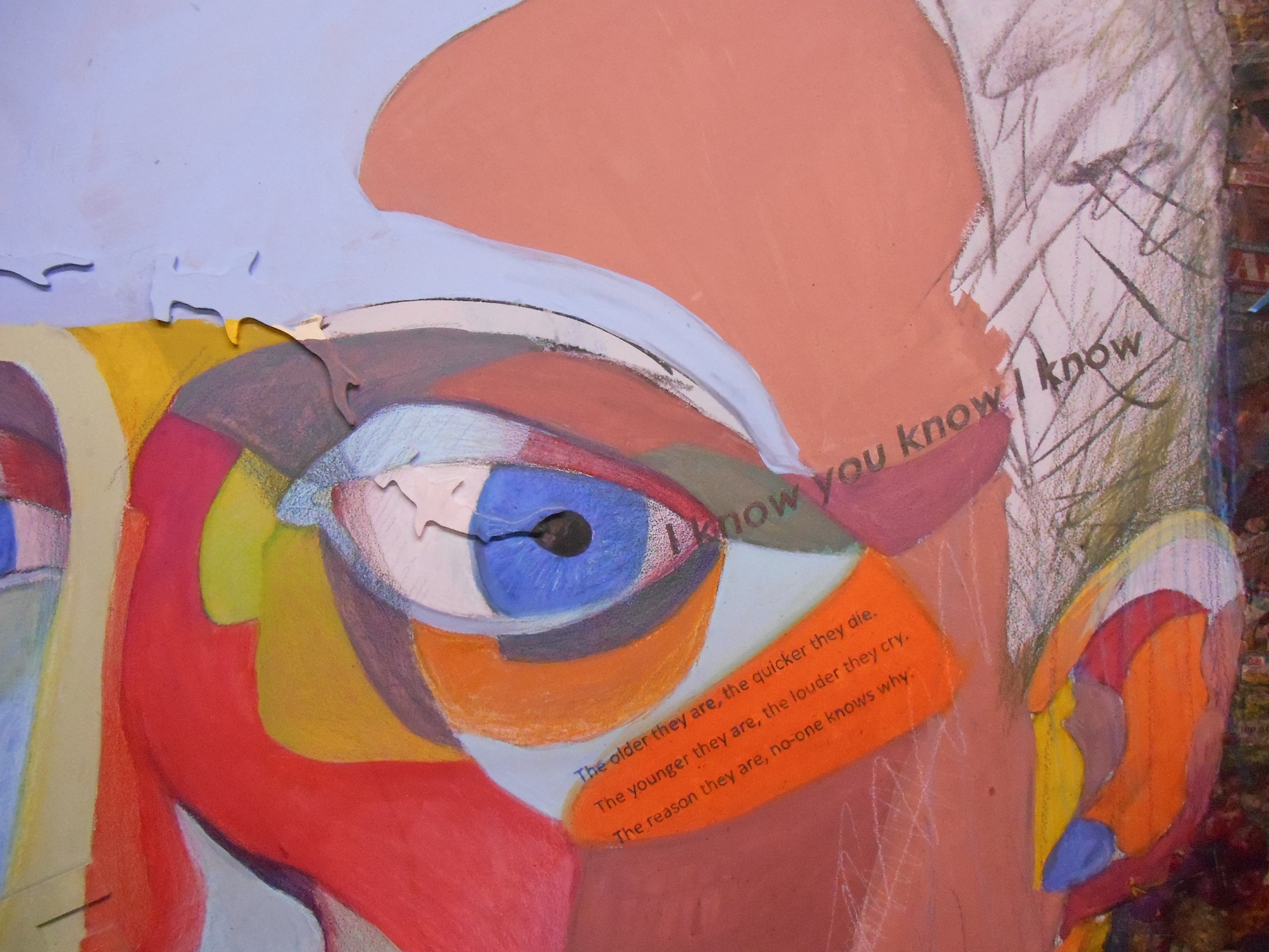 6 foot by 4 foot – paint, coloured pencil, charcoal, wood and collage on wooden board.