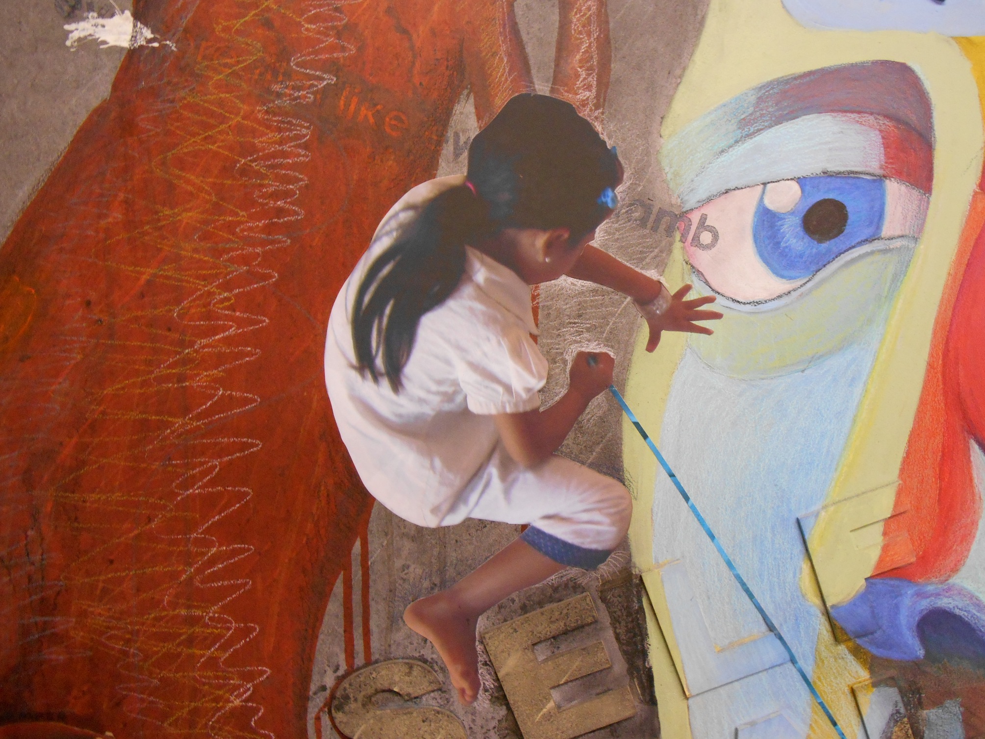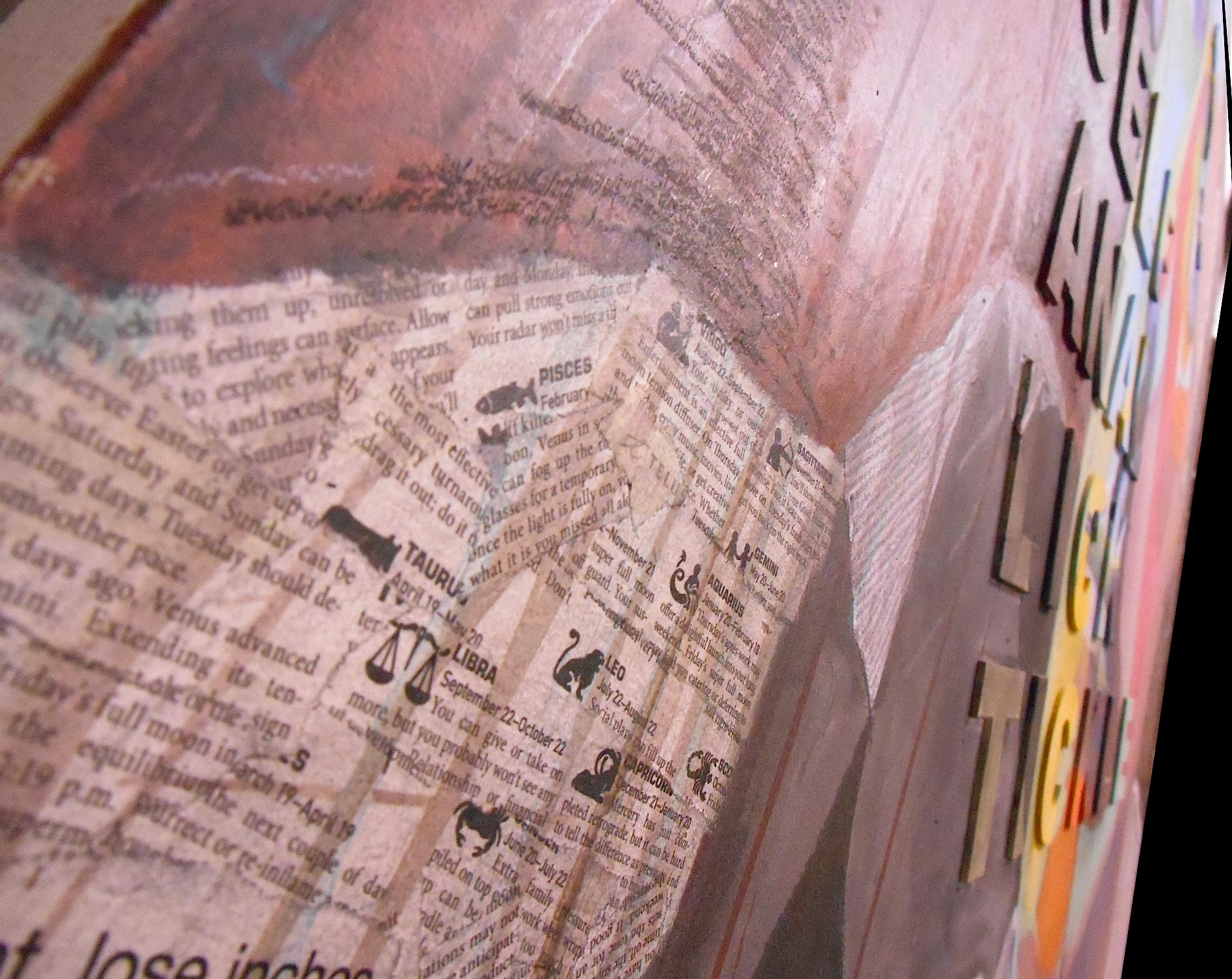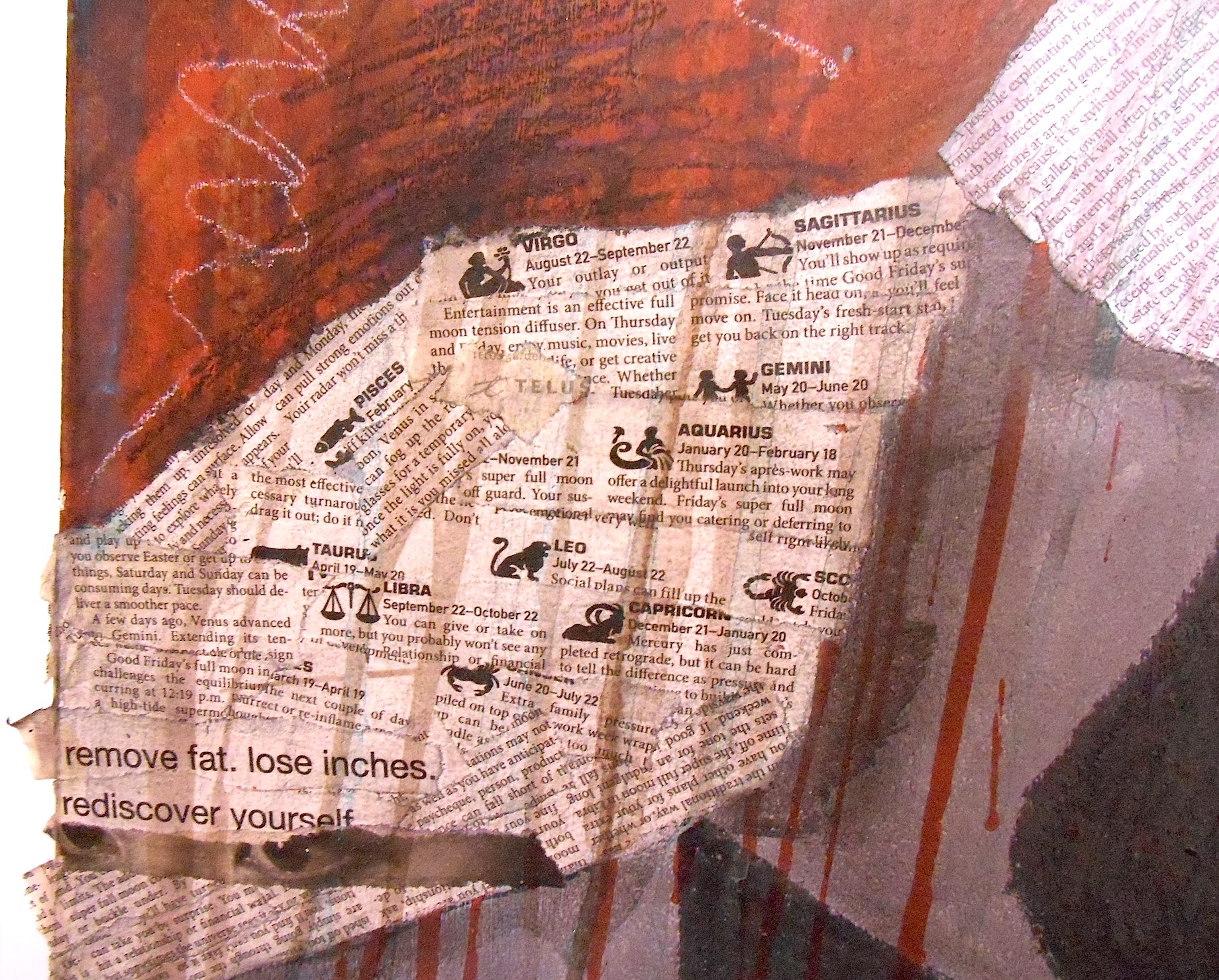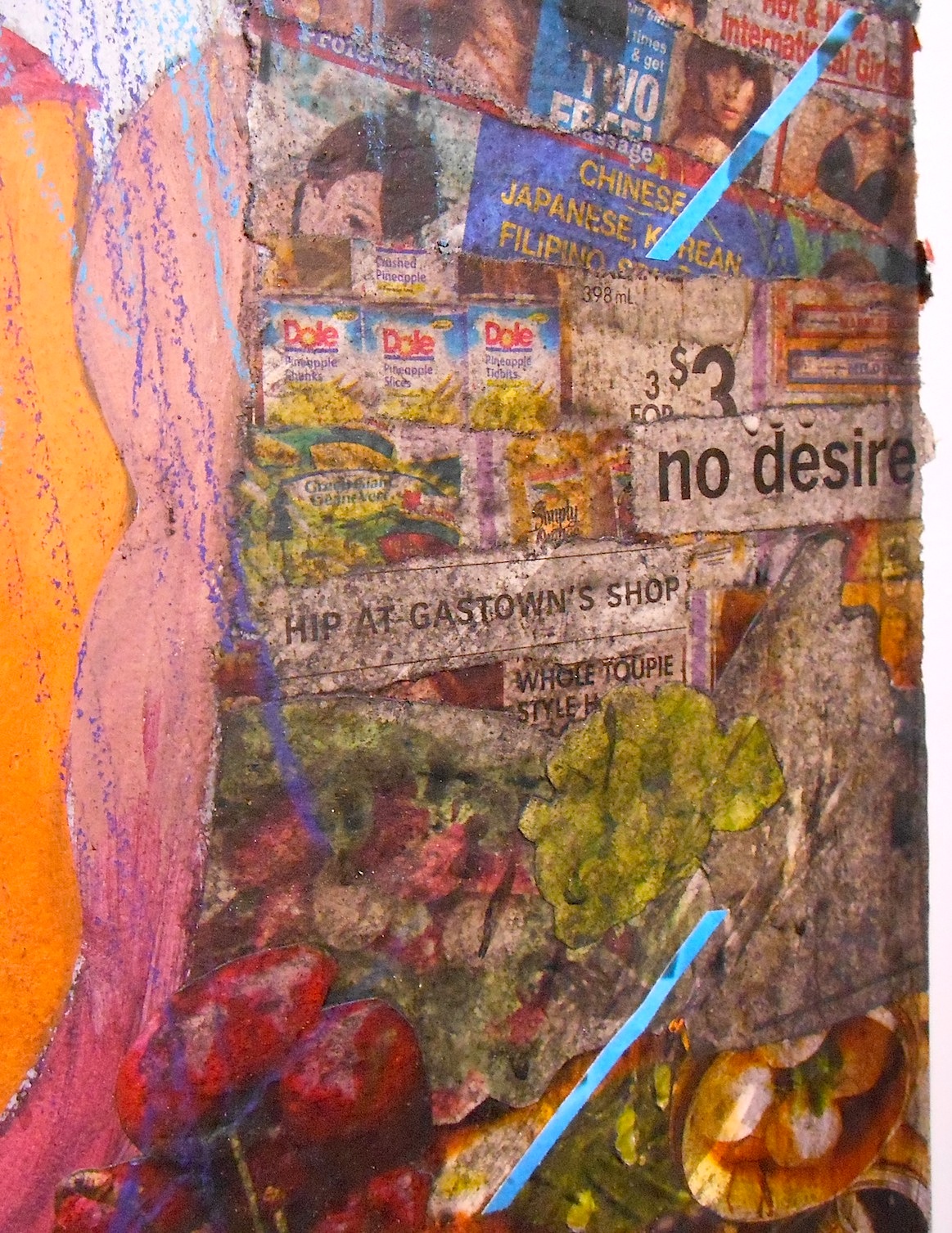 6 foot by 4 foot – paint, coloured pencil, charcoal, wood and collage on wooden board.