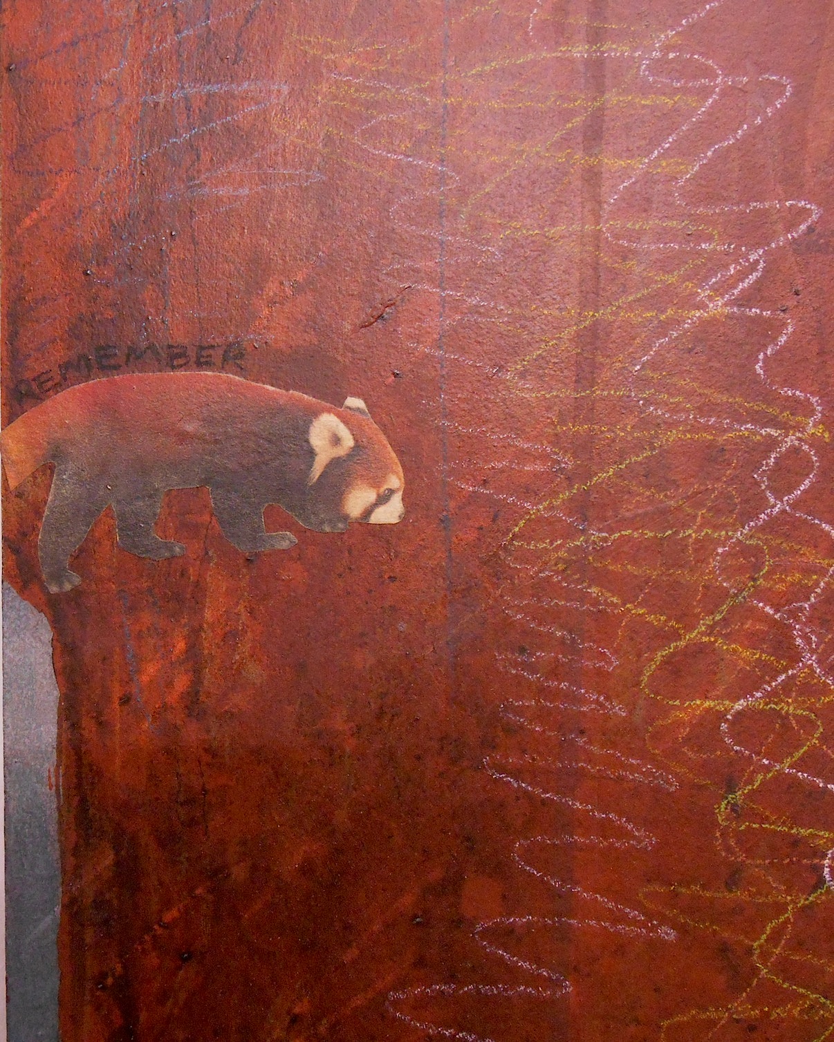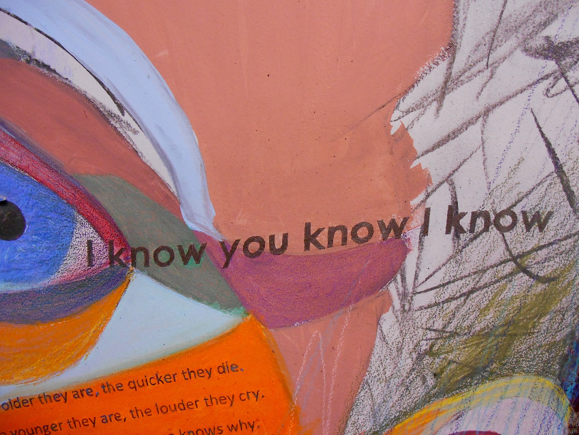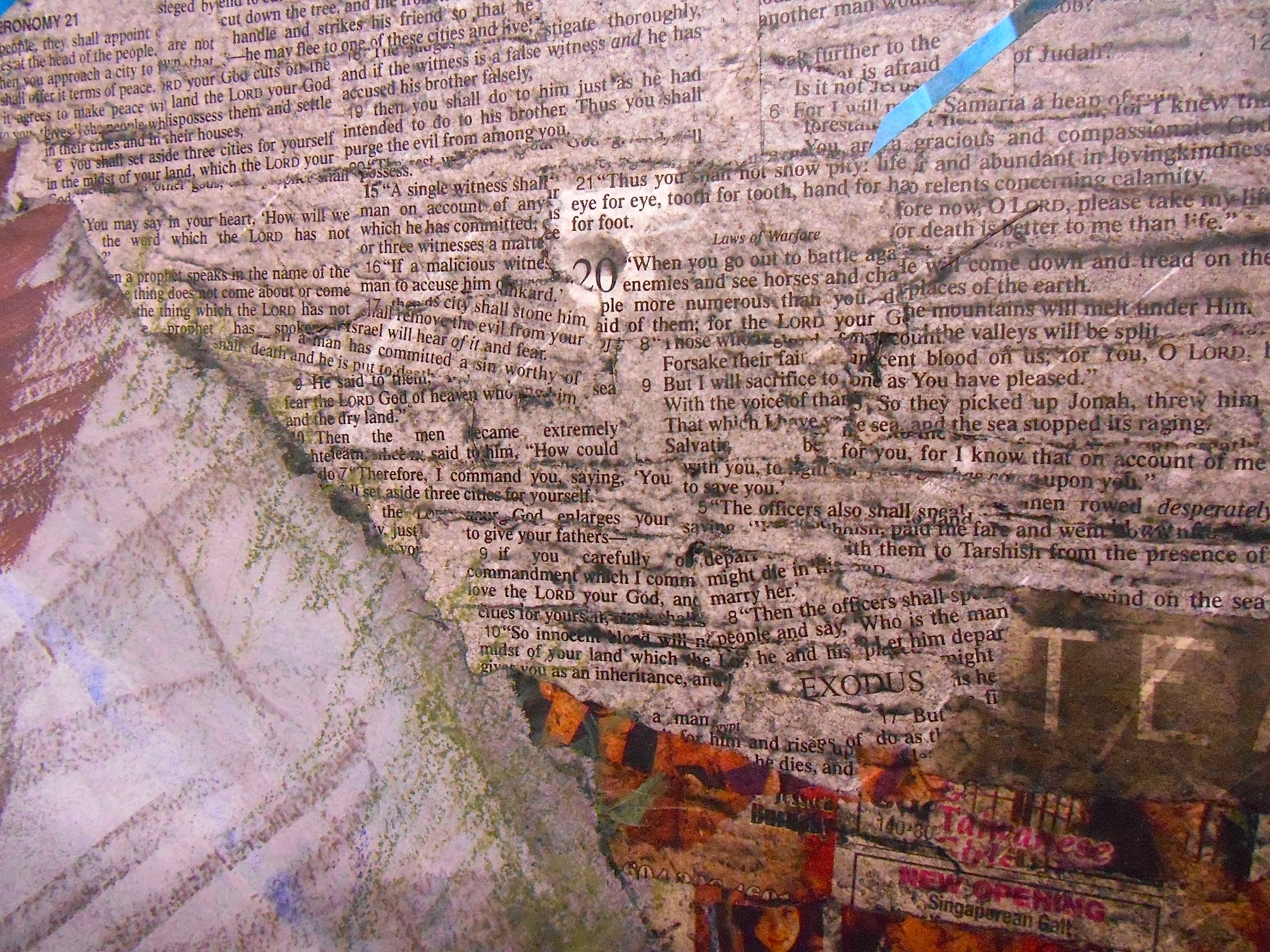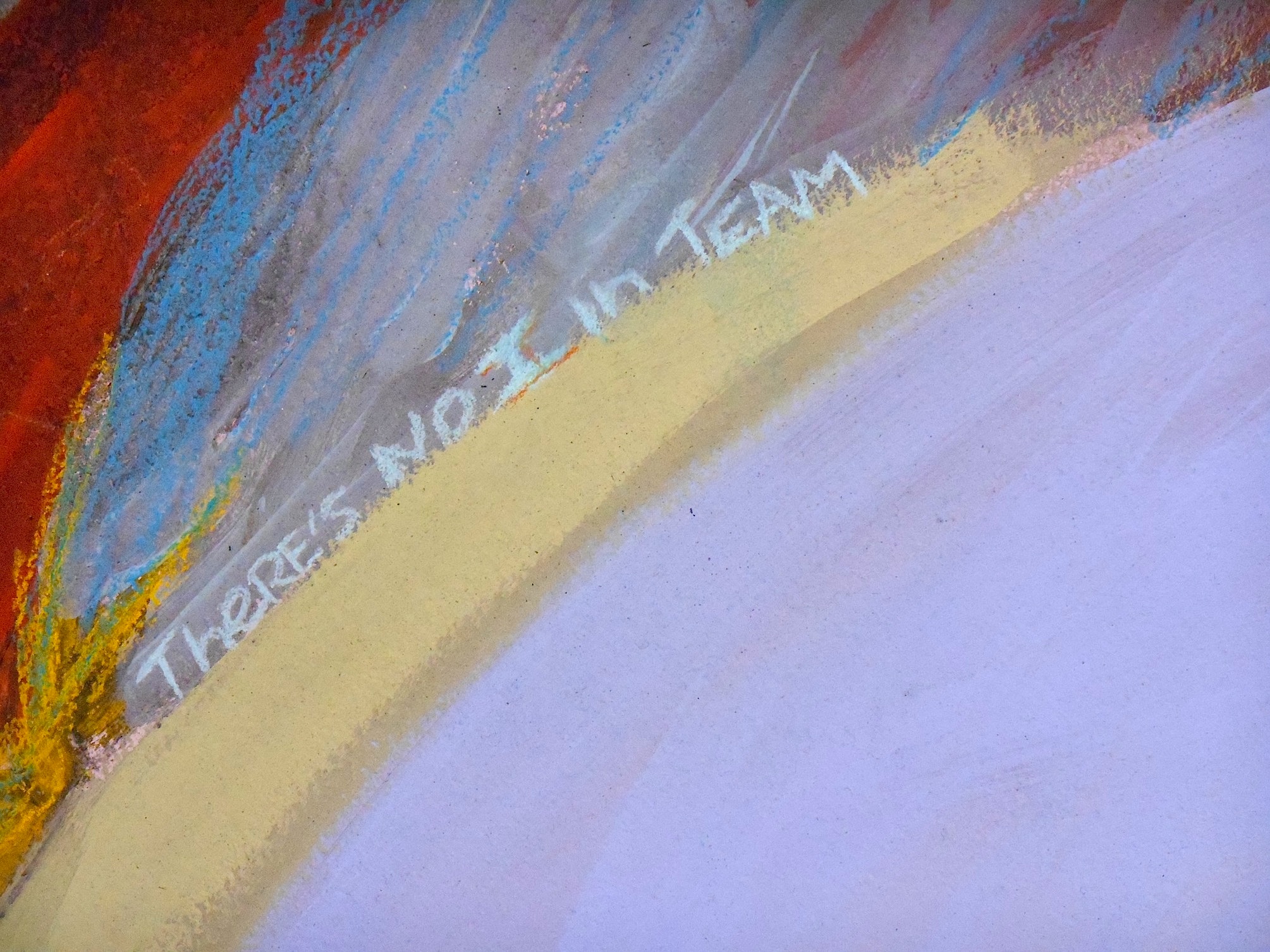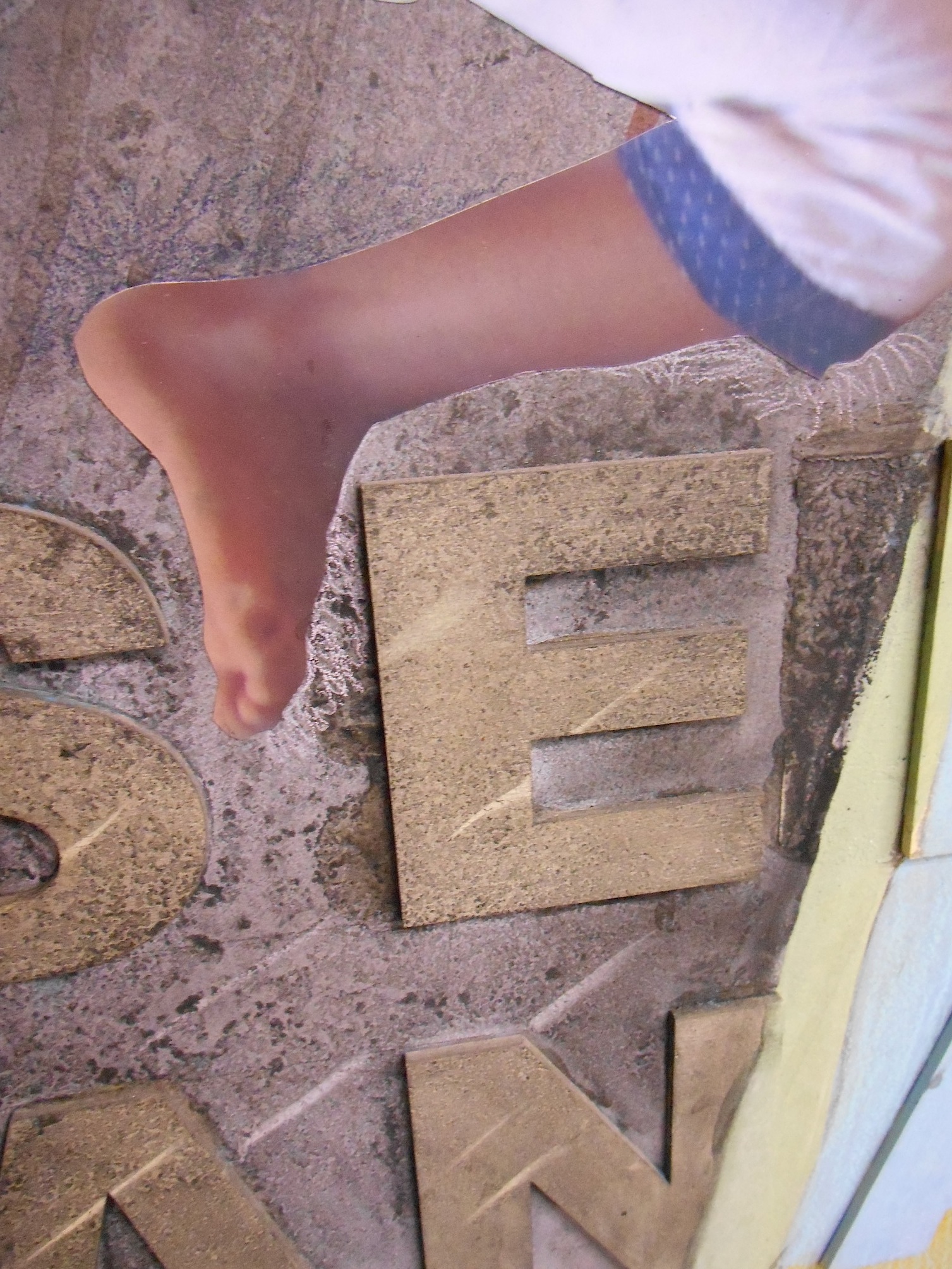 6 foot by 4 foot – paint, coloured pencil, charcoal, wood and collage on wooden board.