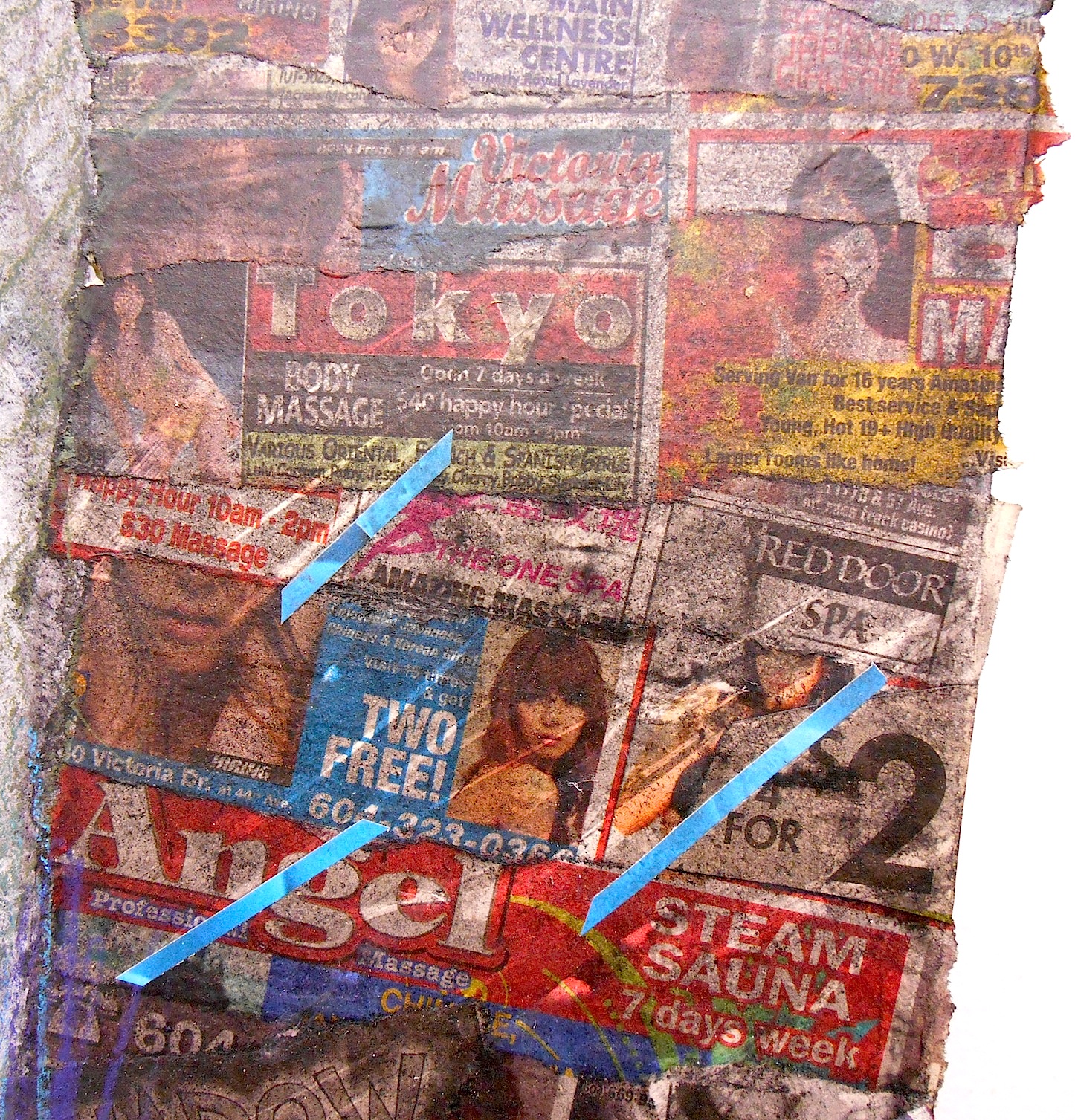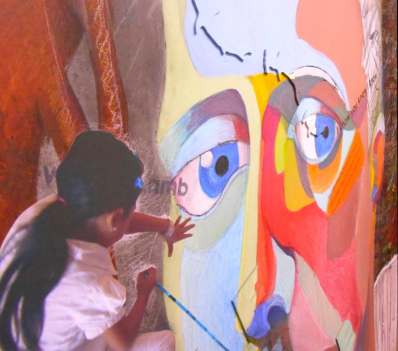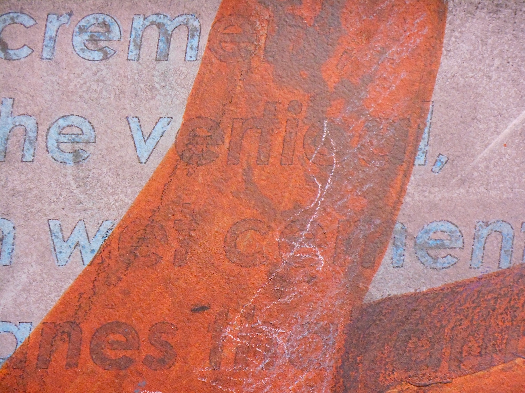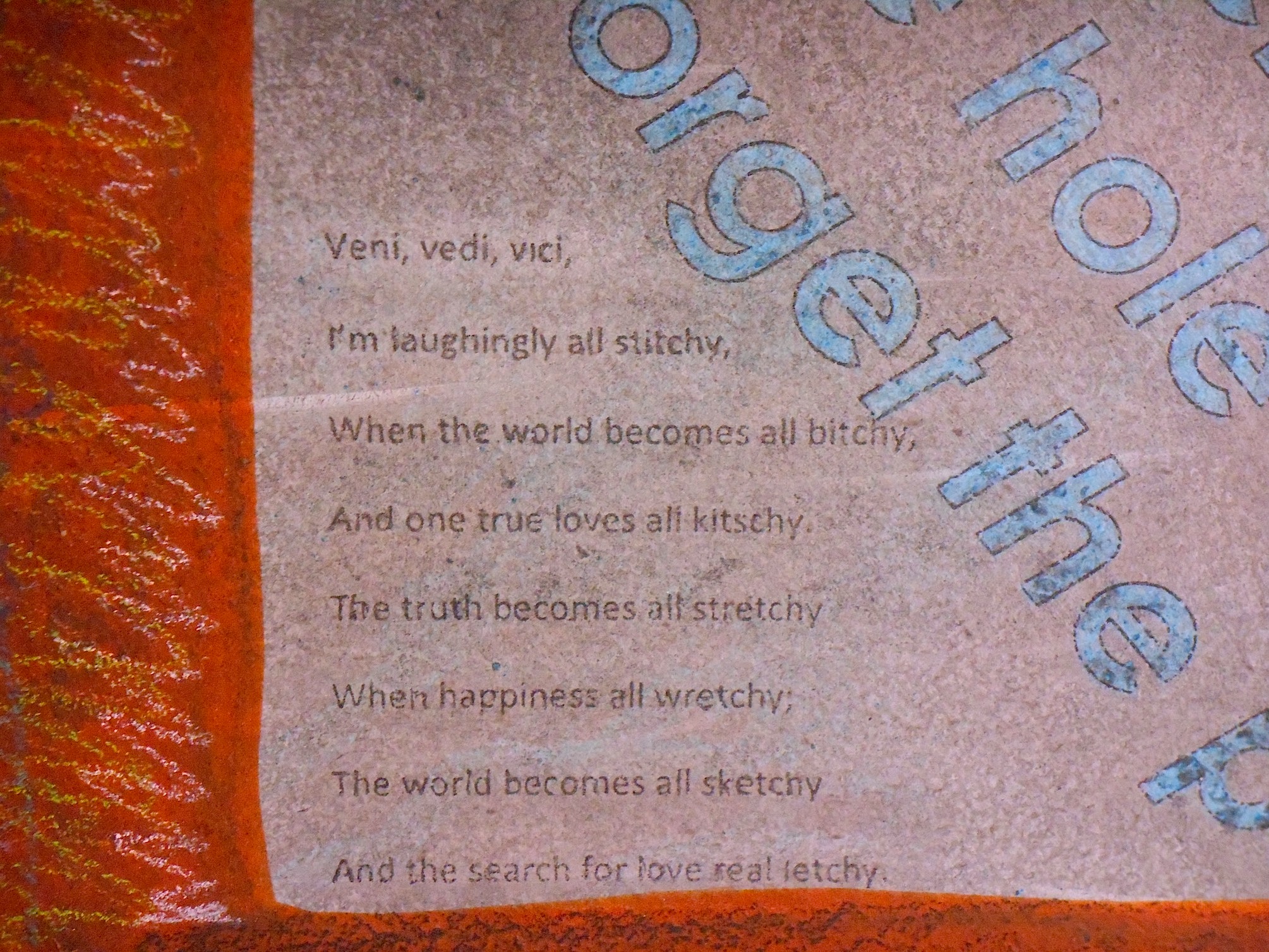 6 foot by 4 foot – paint, coloured pencil, charcoal, wood and collage on wooden board.