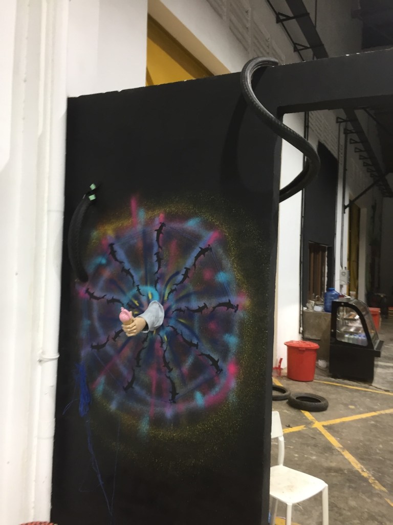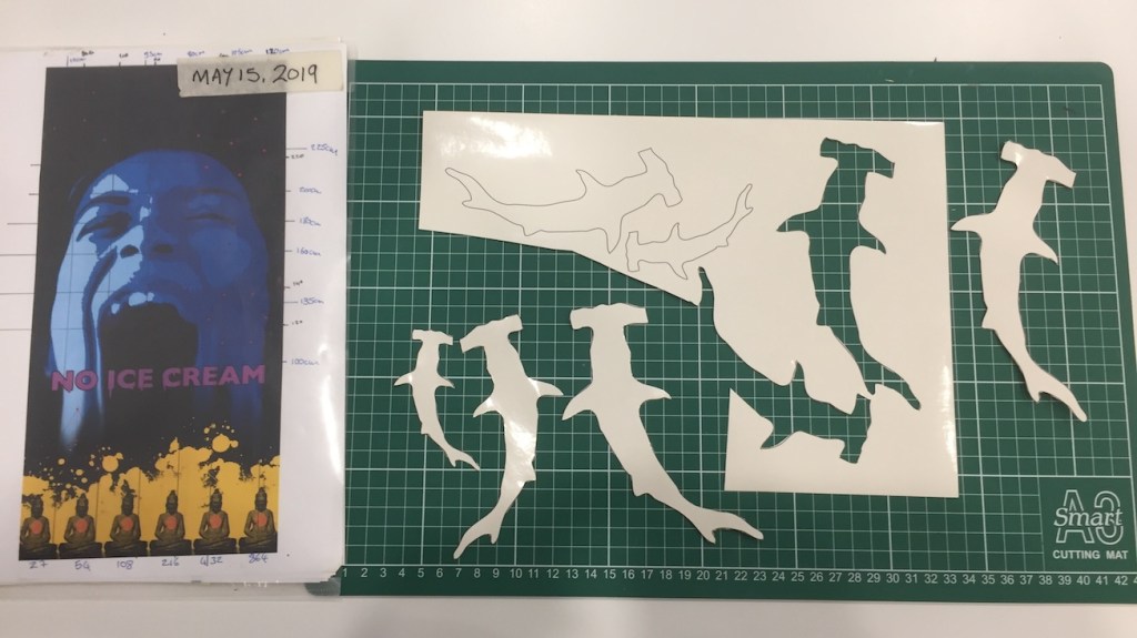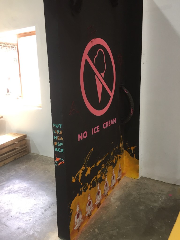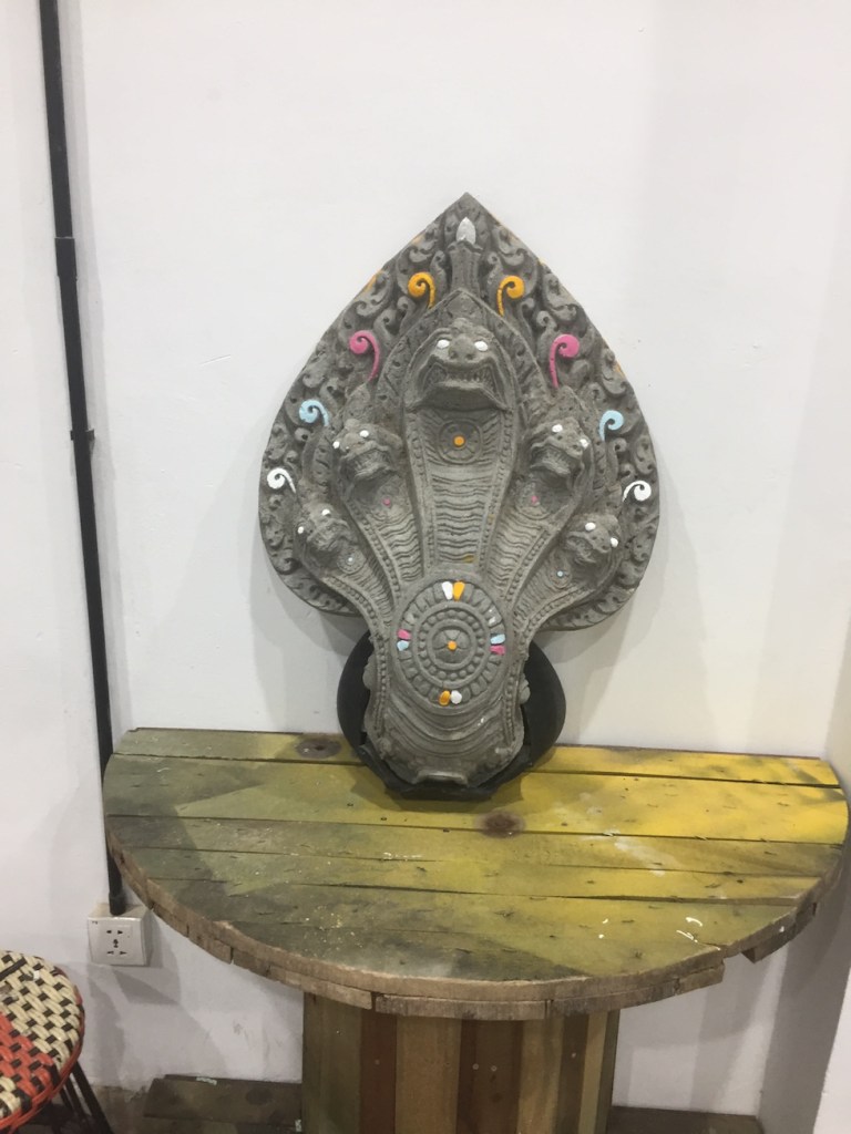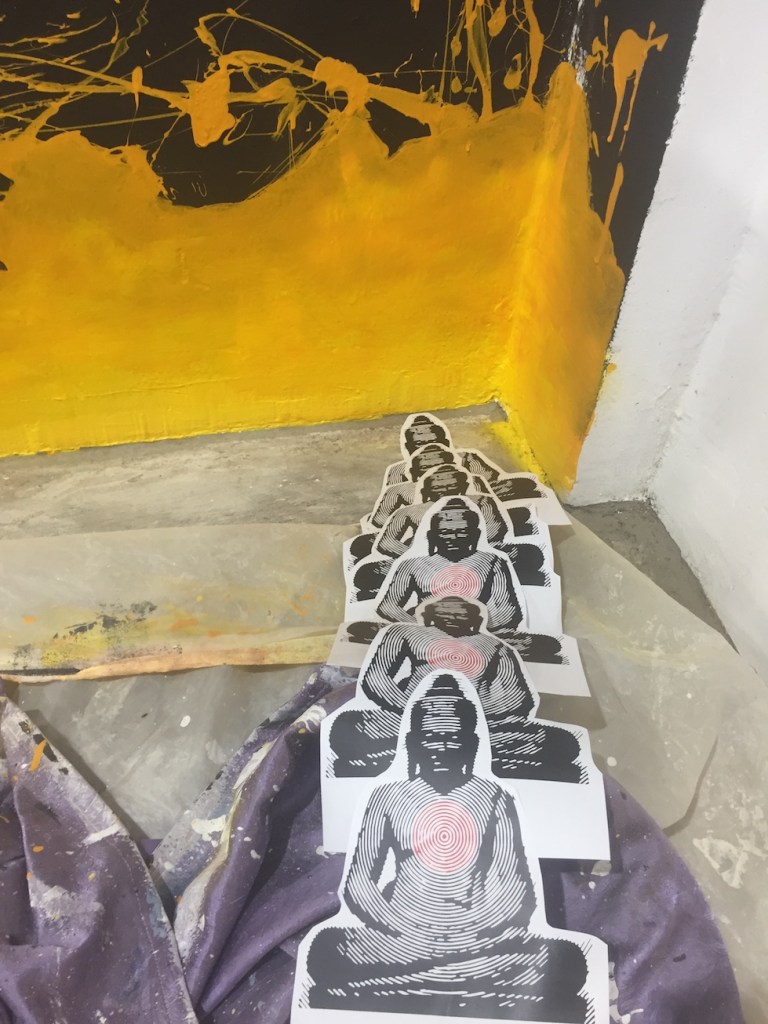 As part of the June 2019 opening of the Kbach Arts space at the Factory, Phnom Penh, I was invited to create an installation. Located on three walls between the 2D & 3D galleries of the Kbach Arts space, the piece examines sound through three separate yet interconnected Cambodian viewpoints: the absence of voice (the suppression of expression), the sound-wave forms and numerical vibrations in Khmer temples.