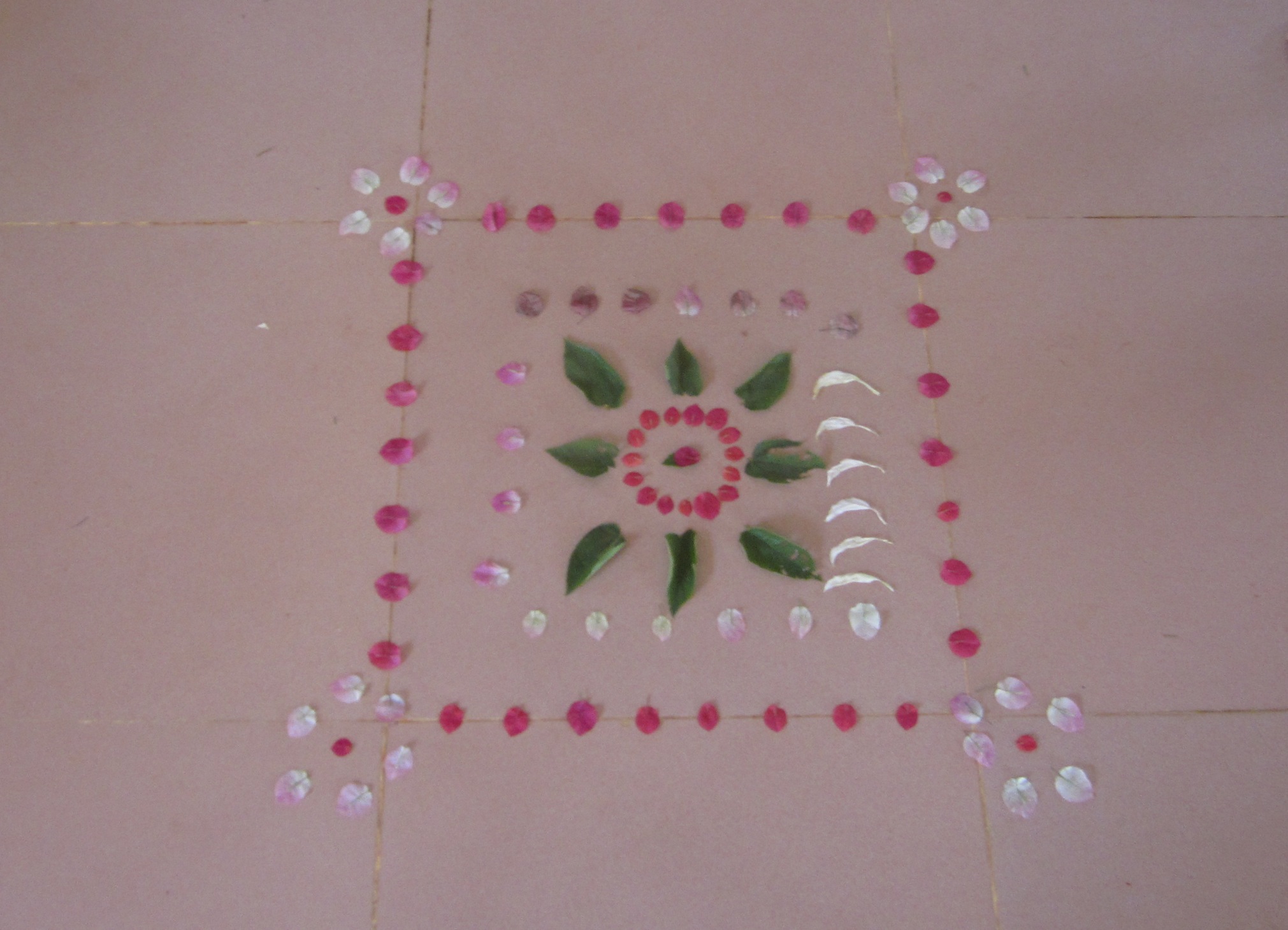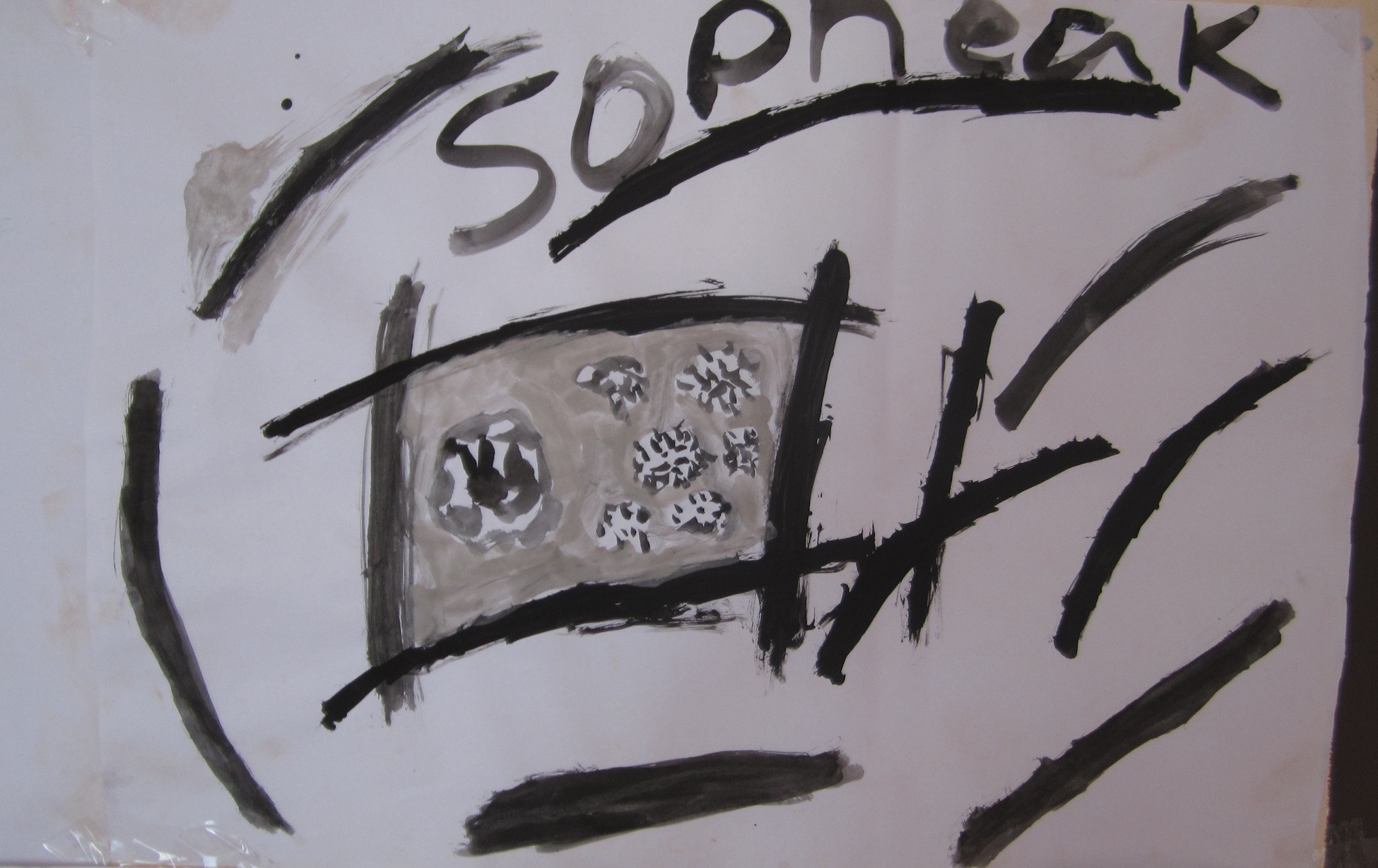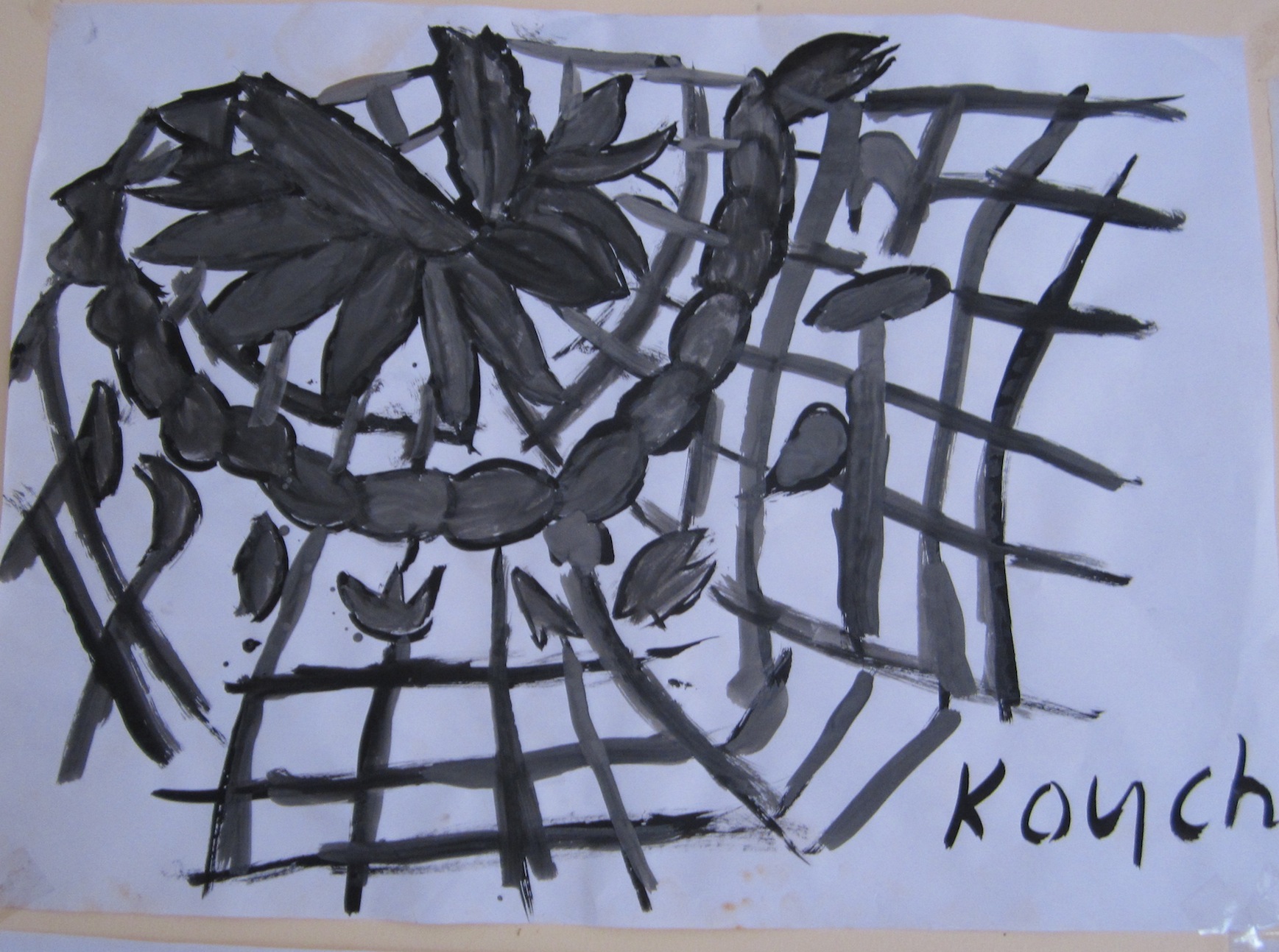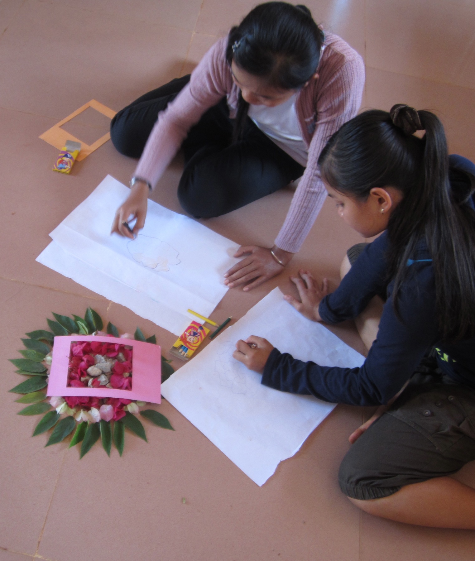 The main project aimed to introduce students to abstract art and involved showing them Andy Goldsworthy’s work. The children were asked to collect natural objects from their local area to create temporary sculptures with their found materials. Once happy with their installation, the children, who ranged in age from 6 to 15, were given a frame to create an interesting composition on their sculpture and then asked to draw that abstraction on a large sheet of paper. The final stage was to create a monochromatic painting of their drawing.